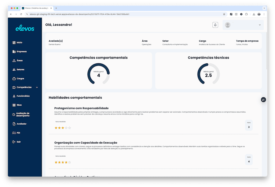 • Gerar planos de desenvolvimento personalizados: Com os dados das avaliações, a Elevos ajuda a identificar as lacunas de performance e sugere ações de desenvolvimento focadas na tríade de transição.